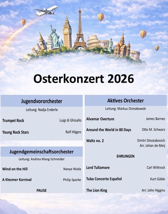 Plakat "Osterkonzert 2026" mit Skylines berühmter Wahrzeichen über Wolken, Heißluftballons und Konzertprogramm in vier Spalten.